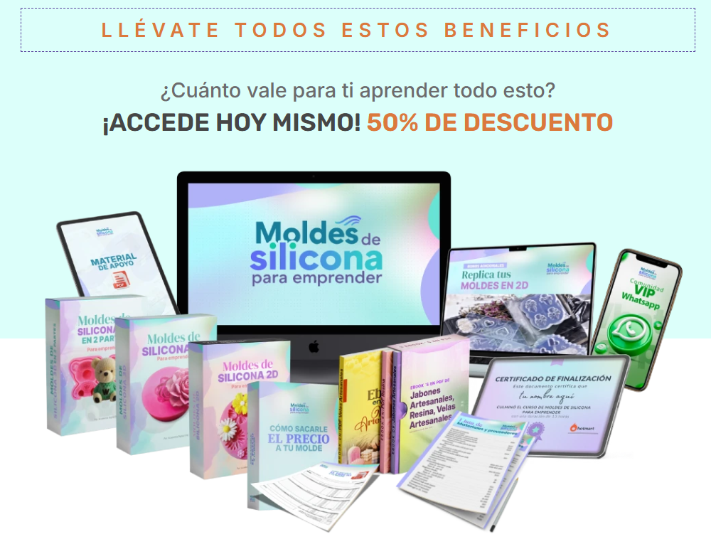 Moldes de Silicona para Emprender” destaca como una opción sólida para quienes quieren iniciar un negocio artesanal rentable, sin necesidad de invertir grandes cantidades desde el inicio. La combinación de módulos prácticos, técnicas avanzadas, marketing, empaquetado, estrategias de precios y soporte comunitario lo convierten en un programa integral con potencial real para emprender desde casa.